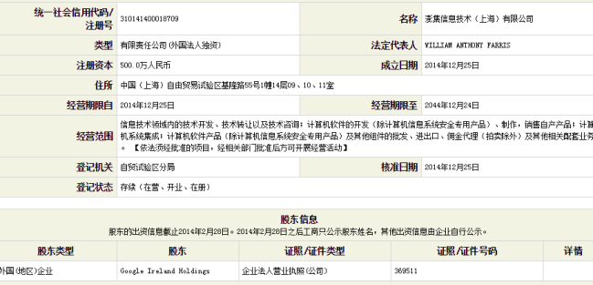 澎集信息成立于2014年12月25日,股東為Google Ireland Holdings(谷歌愛爾蘭控股),法人代表是William Anthony Farris,注冊資本為500萬元。該公司的經營范圍包括:信息技術領域內的技術開發、技術轉讓以及技術咨詢;計算機軟件的開發(除計算機信息系統安全專用產品)、制作,銷售自產產品;計算機系統集成;計算機軟件產品(除計算機信息系統安全專用產品)及其他組件的批發、進出口、傭金代理(拍賣除外)及其他相關配套業務。從澎集信息的經營范圍上看,已經涵蓋了谷歌此前撤出的業務內容,包括網頁搜索和郵箱服務。歌或許期望,可以在上海自貿區享受“境內關外”的政策,作為重返中國的第一步。